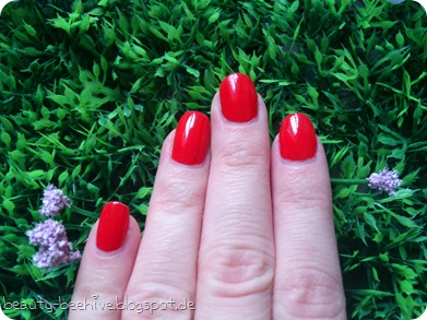 “Snap happy” ist ein kräftiges Tomatenrot und war Teil der “Leading Lady” Collection 2012, daher ist er leider nicht mehr erhältlich. Der Auftrag verläuft problemlos. Mit der ersten Schicht ist der Lack bereits gut deckend, eine 2. Schicht rundet das Ganze aber noch ab. Dank Sally Hansen Insta Dri war er nach sehr kurzer Zeit stoßfest. Die Haltbarkeit war bei mir sehr gut. (Nach 3 Tagen hatte ich nur leichte Tipwear).